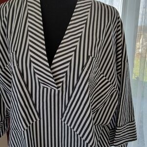 Calvin Klein vneck tunic top. Dark gray/white striped. 21" 3/4 sleeve with tie. Measures 29" underarm seam to seam. 17" from shoulder to hem. Materials/wash tag removed. Size 1X EUC
