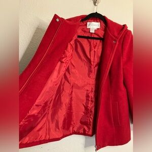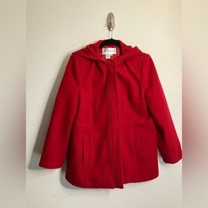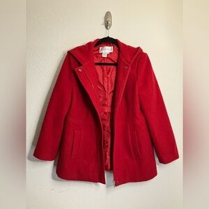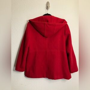 Stylish red pea coat by Chadwicks. Features a classic design with a hood and hidden zipper/ snap front closure. In excellent used condition with very light wear and no damage.