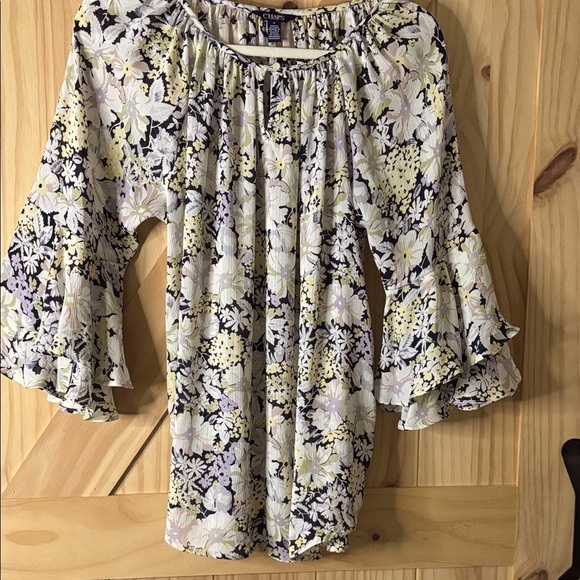 EUC Chaps Floral Bell Sleeve Blouse - Black, White, Cream
