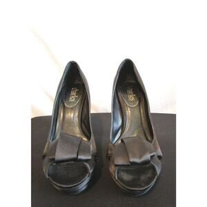 EUC!! Charles David Black Satin Bow Peep Toe Platform High Heels Size Women Sz 7