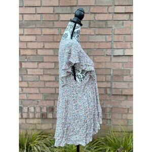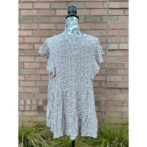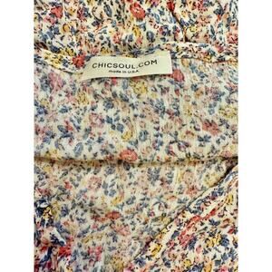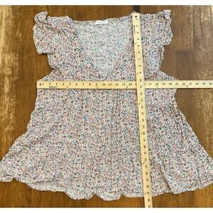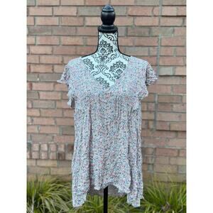 Excellent used condition Chic Soul v-neck floral tunic length pullover top, size 1X or 14-16. This shirt has been washed but not worn. Super cute top with small floral pattern throughout. Ruffle/flutter sleeves and ruffle hem. Cute with jeans or leggings. Perfect for spring/summer!