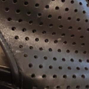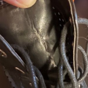 Very gently used black peep toe booties by Chinese Laundry. These add a fun sporty or edginess to any outfit. There are some minor flaws all noted in the pictures. The tongue on each shoe is cracking under the laces. It is not noticeable when wearing and one is worse than the other. I am a true 7.5 size shoe and these fit well. I have really skinny, bony feet, so they felt a bit big around my foot. Please inspect the pictures for details. I tried to zoom in on all noticeable flaws.