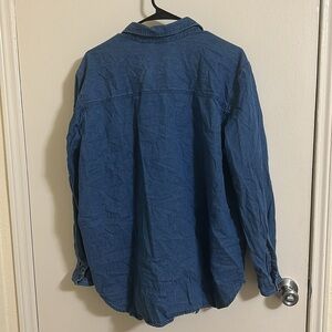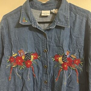 EUC Christmas Festive Embroidered Poinsettia Candle Denim Button Down Shirt