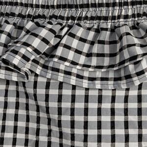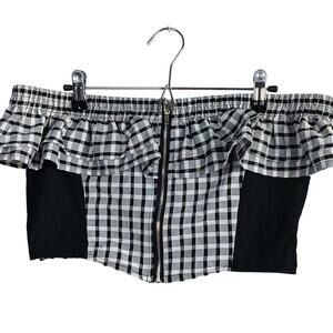 This is from Cider and is a well-made off the shoulder crop top. It has a 1 1/4 inch elastic that goes around the top and would be just above the breast. Below the elastic is a double ruffle. It has a working metal zipper that zips in front. The fabric is a black, gray, and white plaid, and it has solid black panels on the sides of the chest. It is 50% cotton and 50% polyester.