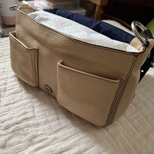 Two front pockets | Magnetic front flap | One open back pocket | One inner zip pocket | Two multifunction slip pockets | Dark blue cross grain interior lining | Silver tone hardware | Hang tag | 9.5" drop strap, 8" height x 12" length x 3" depth, See pic for tiny scratch on one of the front slip pockets.
