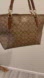 Classic Coach tote in signature monogram canvas. Features dual leather straps with silver hardware. Spacious main compartment with zip closure. Timeless design for everyday use.