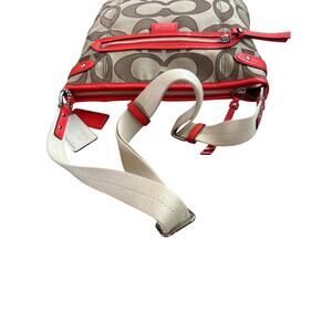 Beautiful EUC 2014 Coach signature crossbody. It has a tan and brown signature canvas print with orange leather trim and two hangtags. It features a zippered closure and an adjustable canvas strap up to 22” for crossbody wear. The bag is 12” x 10” and has an exterior zipper pocket, inside zipper pocket and two slip pockets. The hardware, including zippers and strap attachments, is silver-toned.