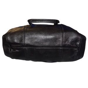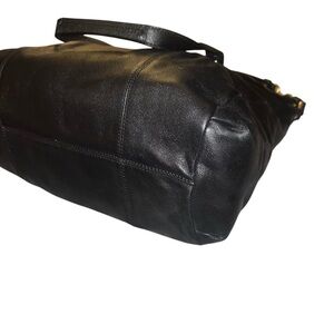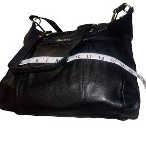 This sophisticated Coach shoulder bag in black leather features a structured design and elegant gold-tone hardware. Comes with shoulder tote handles and an adjustable crossbody strap! Its timeless style and high-quality craftsmanship make it a versatile accessory for any occasion.