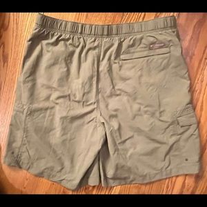 Enjoy the comfort and features in these Columbia clean-cut, fast-drying nylon swim shorts with an interior mesh brief, 2 side pockets, zip security pocket on left cargo, velcro flap pocket on right cargo both with water holes. Elastic waistband with exterior adjustable buckle, a small front interior velcro pocket at waist plus a zip security pocket on back right. Waist ~36 inch, inseam ~9 inch. EUC Size L #petfree #smokefree