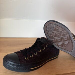 Excellent preowned condition, look like they have never been worn before. Unique Converse, have never seen the same material before. Brownish tweed material--looks like a really dark red and black mixed together. Gold shoelace eyelets and trim on the black rubber bottoms.