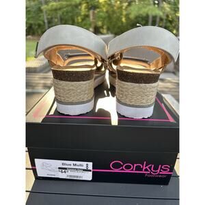 The EUC Corkys Roadie Blue Multi Women's Shoe in size 8 features an open toe, Velcro closure for all 3 straps and a 2.5" wedge heel. This stylish shoe is perfect for travel, casual wear, and workwear, with a color combination of blue, camel, and off white. The comfortable design includes a wedge heel style, making it ideal for summer, fall, and spring seasons. Perfect shoe to transition into fall. Only wore once. The velcro straps allow you to fit the shoes to your feet. Paid $65 from a boutique.