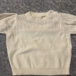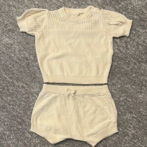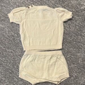 Adorable cream knit baby outfit with short sleeves and shorts. Perfect for a cozy day.