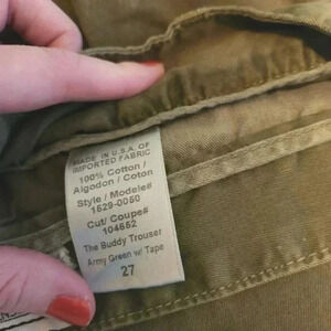 EUC Current/Elliot The Buddy Trouser in Army Green w/Tape, Size 27. These are a mid-rise pant. One back pocket is open the other is shut.