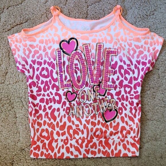EUC Cute Justice Cold Shoulder Pink Orange Animal Print "Love One Another" Shirt Sz 12