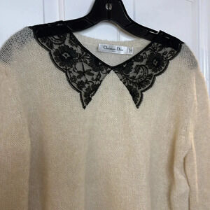 EUC DIOR womens ivory sweater with black lace inset collar size US6