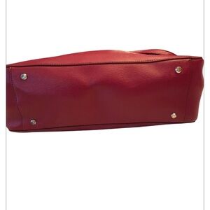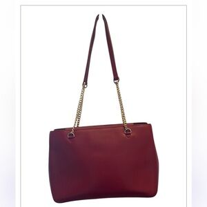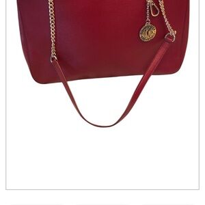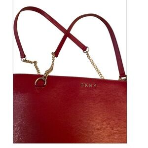 This DKNY shoulder bag in a striking red hue features a structured design with elegant gold-tone hardware and a chic chain and leather shoulder strap.