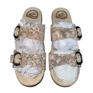 Stylish Dansko sandals with dual straps. Features gold buckles. Comfortable and chic.