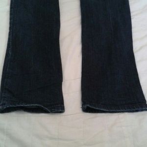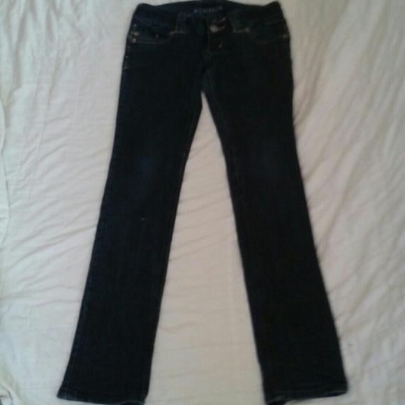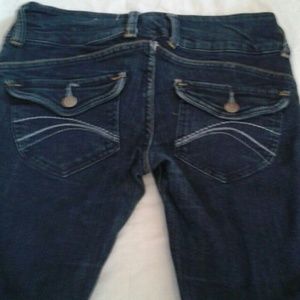 Only worn once! Dark blue decree skinnies with some light brown detail around front buttons and front pockets and has light bluish gray detail on buttoned back pockets! No stains, rips, snags,or fraying! Inseam is 31"