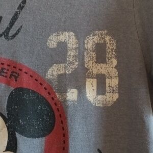 Distressed gray T-shirt with Mickey Mouse Club graphic in red black and white. In Excellent preowned condition. Graphic is meant to have that distressed, worn in look. Fading is done on purpose, combined with throw back graphic and font for a retro look.