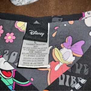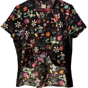 EUC Disney Positive Vibes Minnie Donald Black Print SS pockets side slit Sz L scrub top pit to pit 22” shoulder to bottom 26