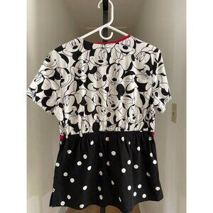 EUC Disney Women's Scrub Top Mickey & Minnie Mouse Print Black & White with Red