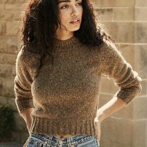 Doen Kaia sweater featuring a crewneck, functional buttons at the shoulder, ribbed trim, fitted, cropped length, and a mid to heavyweight wool blend yarn in a brown marl color.
