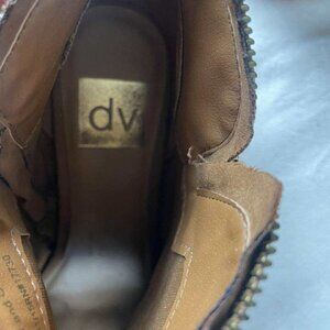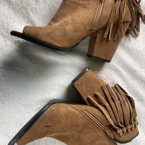 EUC Dolce Vita Tan Peep Toe Fringe Micro Suede Block Heel Ankle Bootie size 9