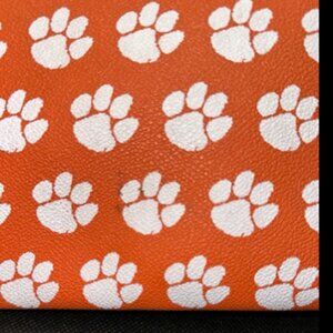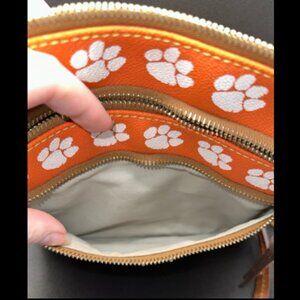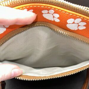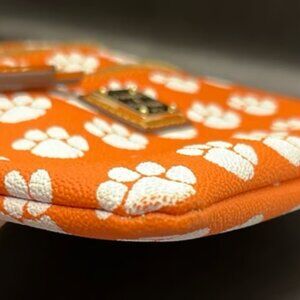 Stylish and functional, this Dooney & Bourke crossbody bag features a vibrant Clemson orange background with playful white paw prints. Perfect for adding a pop of color to any outfit!