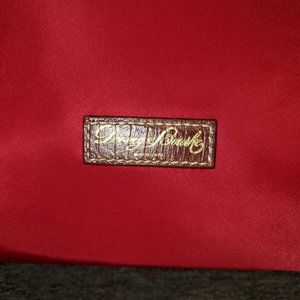 A beautiful Red Head...she is a stunner! This medium sized gal is made of nylon and has a beautiful leather strap. The inside is completely clean with no markings. She features a divider, zipper pocket inside, along with two slip pockets and one side zipper pocket. There is not a mark on her. Please look closely at all pics.