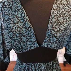 Brown and Teal tie dress. Size Medium. It has 3/4 cold shoulder sleeve. Laying flat 14 inches armpit to armpit and 34 inches from shoulder to hem.