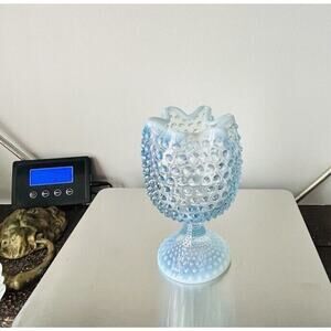 Excellent Used Condition (EUC). This is a vintage Duncan Miller Blue Opalescent Glass Vase with a ruffled and crimped design. It stands at 6.5 inches tall and is made of glass. The vase features a hobnail pattern and a footed base. It is from the Mid 20th Century and was produced in the United States. This decorative piece weighs 1 pound and 7 ounces, with a width of 3.5 inches.