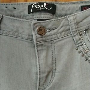 EUC, beautiful silver gray color with studs, rhinestones, lace, and embroidery...These jeans have it all! Waist measures 16 in laying flat, inseam length is 28, leg opening 7 1/2 in, Size 6 Petite, Straight Leg