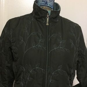 EUC Eddie Bauer Zip-Up Waterproof Insulated Embroidery design Charcoal Jacket ,Size S Women It have 1 inside pocket and 2 outside pockets & Stand Up collar, Charcoal color with embroidery design is light blue , the color is little dark to the 2nd photo, 100% polyester, lining 100% polyester, Eddie Bauer have lifetime warranty without receipt . # 19 ch