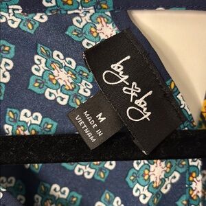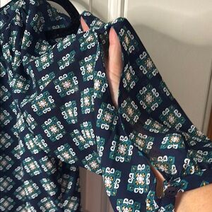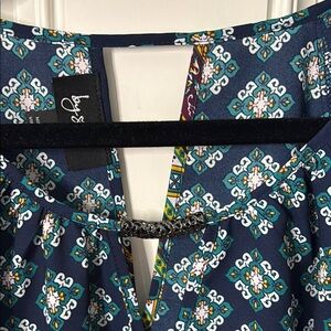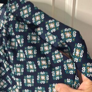 This stunning blouse features a captivating blend of blue and yellow hues, perfect for adding a pop of color to your outfit. Its elegant design ensures a flattering fit, making it a versatile choice for both casual and formal occasions. The blouse's unique pattern adds a touch of sophistication to your wardrobe. Sleeves are a 3/4 length with an opening at the top of the sleeve, then another opening at the bottom as seen in the photos. 100% Polyester.