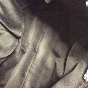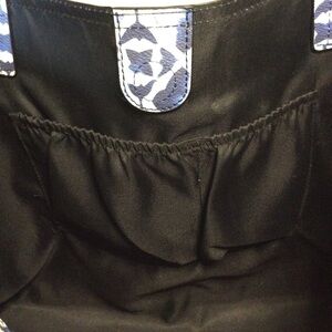 Large faux leather tote in a blue and white print. Inside has 1 zip pocket and 2 slip pockets. Bag is lined in a black fabric. Approximate measurements: 19”W x 13”H x 5”D. Strap drop is approximately 10”. In excellent worn condition.
