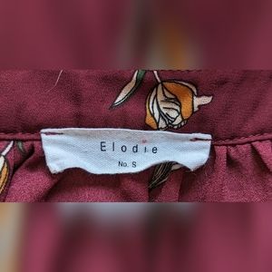 EUC Elodie burgundy semi sheer faux wrap thin elastic band at hip length bottom hem beautiful orange/yellow & green mid size floral print V neck with wrap from right to left sewn on (no fabric ties like a true wrap) 3/4 length sleeves slightly puffed at the top hem and gathered to thin elastic bands cuffs