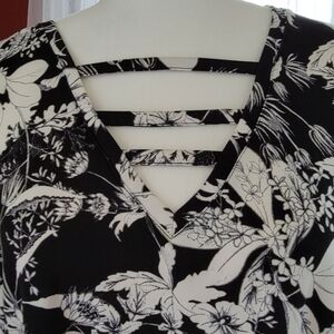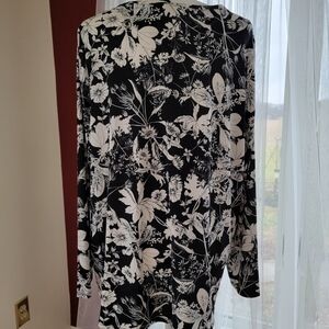 Emaline Black and White Floral Vneck Tunic Top. Measures 25.5" underarm seam to seam. Sleeve measures 24" from shoulder to hem. Lenth is 28.5". Size 1X EUC