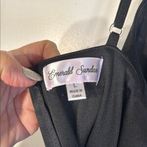 This elegant black dress by Emerald Sundae is designed for a night out, featuring a chic ruched detail that enhances its sleek sheath silhouette. The sleeveless design with spaghetti straps and a V-neckline adds a touch of sophistication. Its midi length ensures a graceful and stylish appearance for any cocktail occasion.