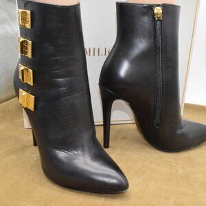 EUC Emilio Pucci 36 6M Black Leather Bootie Ankle Boots Heels Gold Turnlock Logo