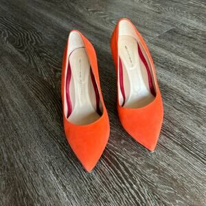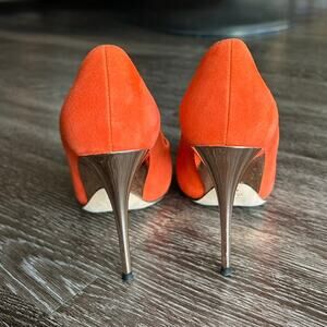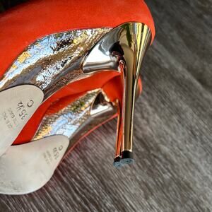 Enrico Cuini pumps, luxury designer heels, tangerine suede pumps, rose gold heel, Italian designer shoes, celebrity worn heels, statement heels, wedding guest shoes, workwear chic, rare size pumps.