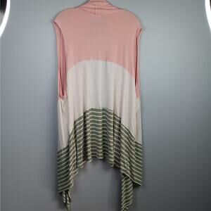 This is a very soft vest with a handkerchief hemline in excellent used condition. It is made of 95% rayon and 5% spandex. It has is rose/pink at the top, white in the middle and green and white striped at the bottom. It is 26 inches from pit to pit.