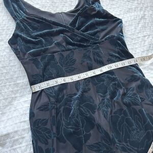 Dark blue teal floral velvet burnout babydoll dress by the brand Eva Rose. Has stretchy mesh and is lined with a zipper closure in the back . Made in the USA.