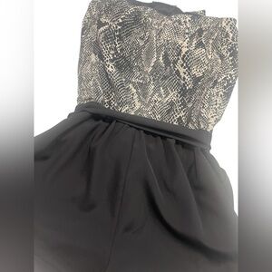 EUC Express Strapless Romper Size XS. Black and snake skin print. Tie waist. Pockets. Cute!!! Silky feel. Measures approximately 13” pit to pit (stretch elastic at bust) and 23.5” long. Smoke free home.