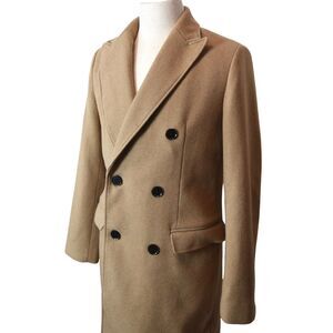 This Express coat delivers timeless tailoring with modern function. Crafted in a camel tan shade, it features a double-breasted front with bold black buttons, structured lapels, and flap pockets for a polished silhouette. Fully lined with a smooth gray interior and designed with a water-resistant finish, this piece blends practicality with classic menswear styling. Perfect for layering over workwear or elevating casual fits during colder seasons. 52% recycled wool