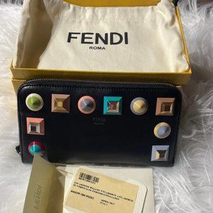 FENDI Vitello Liberty Studded Zip Around Wallet Black PRE-OWNED - Excellent Condition FULL INCLUSION Crafted of calfskin leather with multi-color pyramid studs along the border. The wrap-around zipper opens to a leather and fabric interior with card slots, a zipper pocket, and a currency compartment, 7.25 x 4 inches Studs show minor wear. . This is a pre-owned item and may show minor signs of wear. Buyer understands that they are not buying a new condition item. Please reference all photos and videos for condition as it is part of the overall description. Ask all questions before bidding or purchasing. I try to be as transparent as possible in listings, but lighting and the human eye can only catch so much. Thigs can be missed. Which is why the description and photos are both considered as part of the full description. Ask questions before purchase if you have any concerns; I'm happy to answer any questions. Unless an item is listed as new, please note that a preowned item will likely show some signs of wear. All Sales are Final! Questions? Leave a comment below!