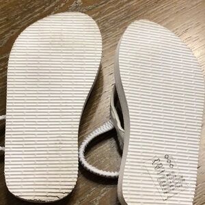 EUC white flip flops for flower girl has white flower with rhinestone, heal strap. No damage, stains, or odor. Very minor wear from one time use. Great for a beach wedding.