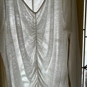 This is a women's Frame white sheer 100% linen shirred front long sleeve top in EUC and is a size large. It measures 22" pit to pit flat.