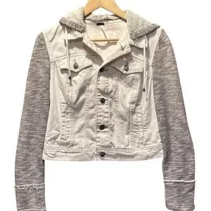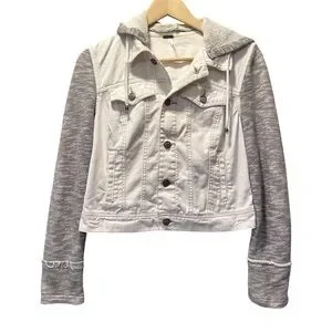 Trendy jean jacket with a white body and gray sleeves. Features a hood and button closure. Ideal for casual wear.