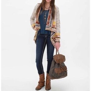In great pre-loved condition gorgeous southwestern blanket style high low hems cardigan from Freeway in size small. No flaw. Cotton/polyester Blend materials. Loose fitting so might a medium too. Aztec geo like patterns. Can be worn belted or open style. ❌no trades. Open to reasonable offers. Bundle more items together to save more. Thank you‼️