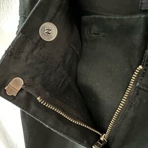 Fabulous hipslung black pants in excellent condition. There’s a subtle pinstripe to the cotton twill fabric as well as a bit of stretch. Slight bootcut, not skinny. Buttoned coin pocket and buttoned back pockets(they make your bum look really nice!) Belt detail looks super cool but it is attached and doesn’t actually work like a belt, FYI! I think it just looks like one in case you don’t want to wear a belt. Only flaw is the hook and eye is missing its ’eye’. There’s nothing for the hook to hook to which isn’t a problem for closure since it’s a 3-point closure: buttoned flap inside, and the zipper as well as the hook and eye. Easy to fix! These are great pants! No size tag other than the ‘30” inseam’ at the top but I e given measurements below.